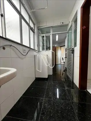 - Cozinha planejada, rica em armários sob e sobre bancadas, mesa para refeições rápidas. Piso em granito e paredes em cerâmica.