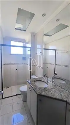 Banho social, piso cerâmica, armário sob a bancada de granito, box com vidro temperado.