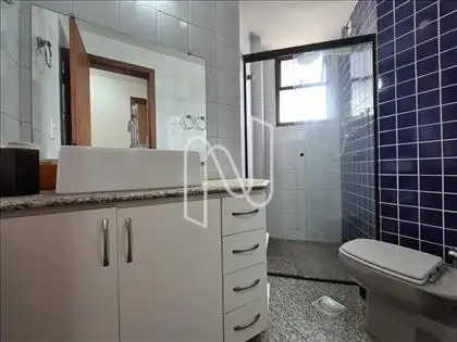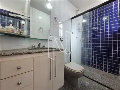 • Banheiros com bancadas em granito, armários sob bancada e box em vidro temperado