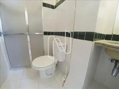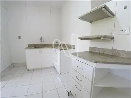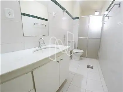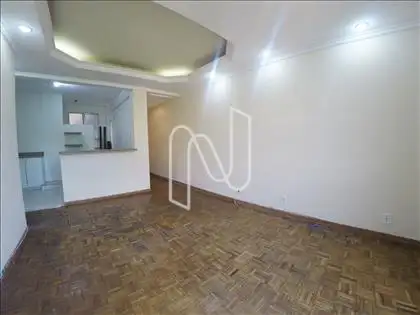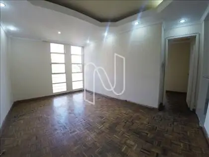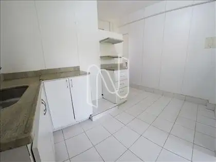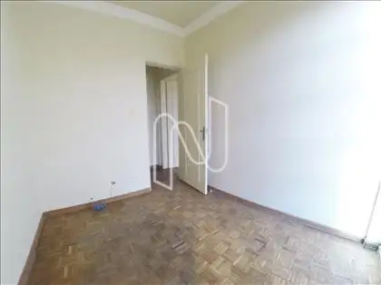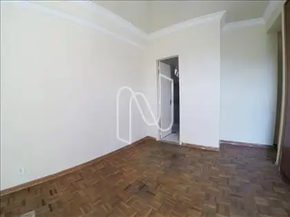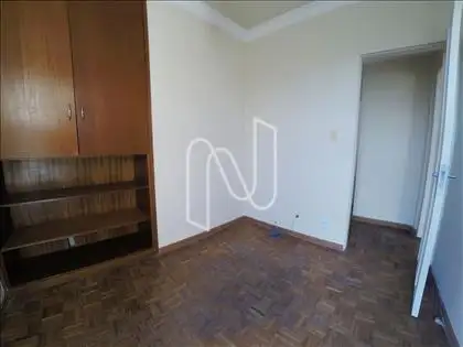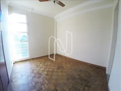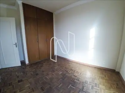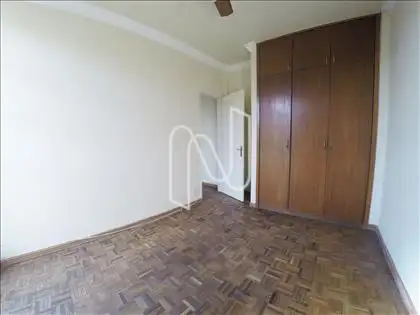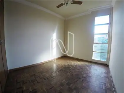Amplo apartamento de 3 quartos com armários, sendo 1 suíte, piso em taco com rodapé em madeira, ventilador de teto e janelas tipo basculante.