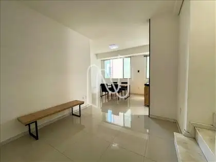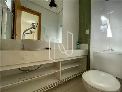 - Sala de estar e lavabo com piso em porcelanato e área externa privativa com bancada em granito.